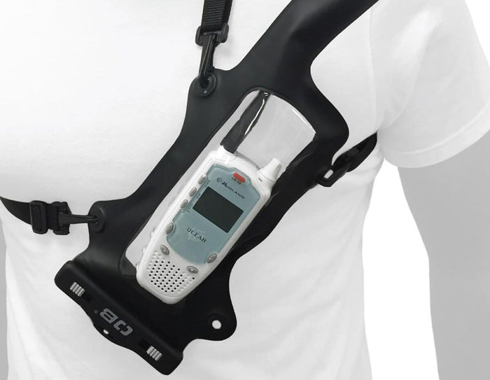 Suitable for handheld VHF radios with left or right handed antennas; this 100% waterproof VHF case features a 3-way chest harness and transparent front and back window so you can have full use of the device while it is safely sealed inside using our Slide Seal System™.